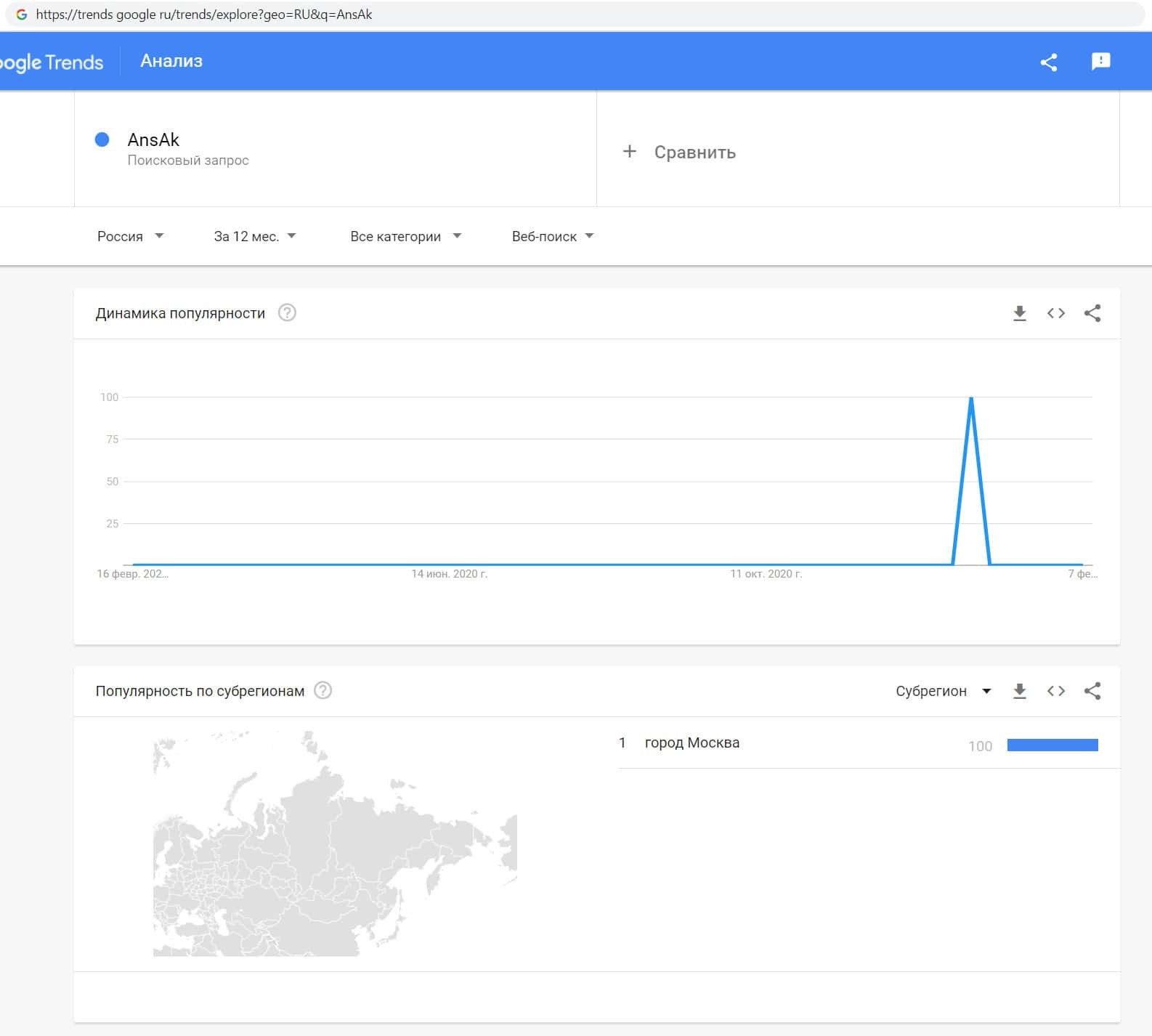 Далее мы решили проверить количество запросов конторы Ans Ak по названию фирмы, но без пробела, а именно "AnsAk". Данный запрос выполняют только жители Москвы.