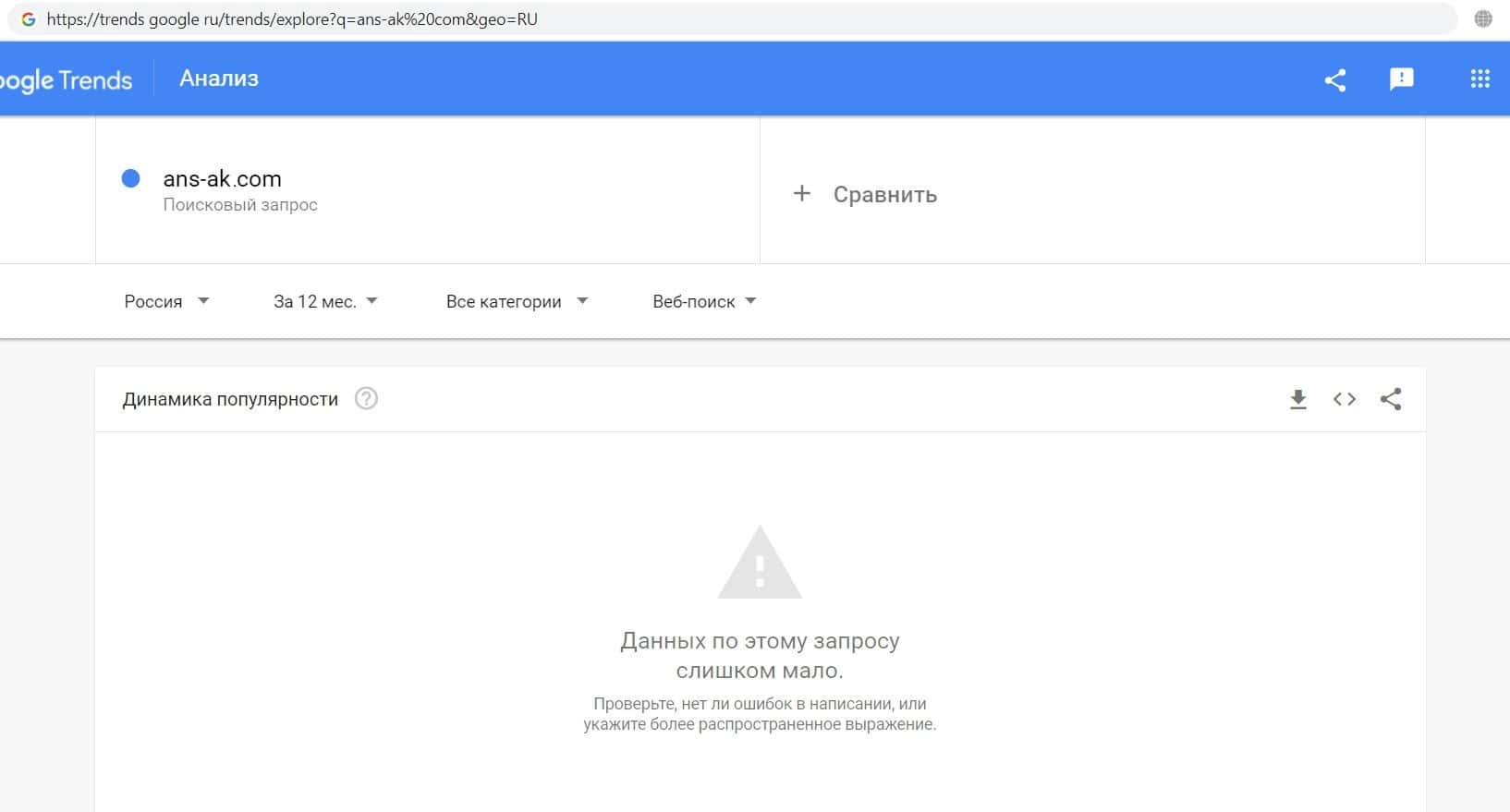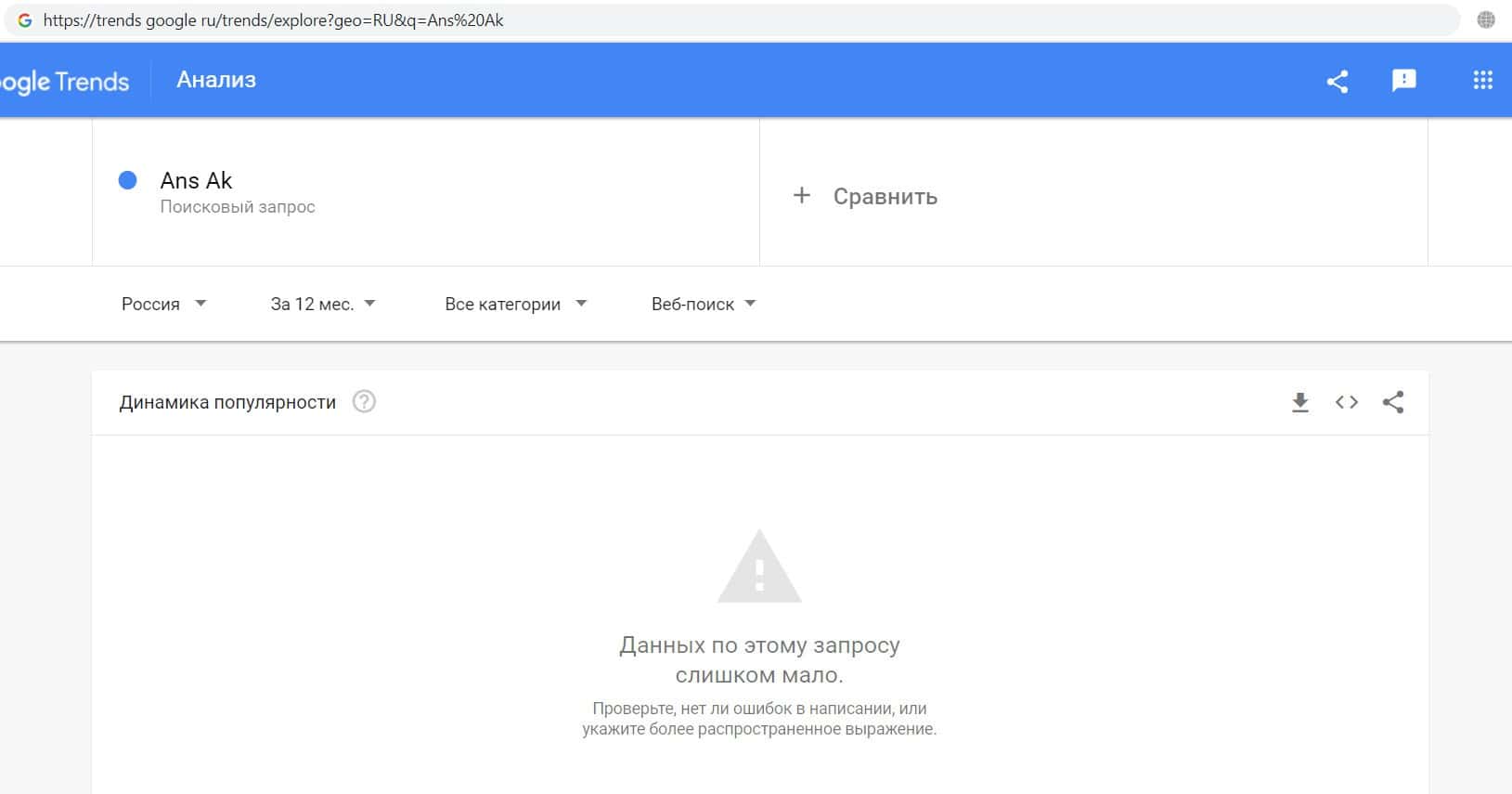 Проверили мы и количество запросов конторы лохотронщиков Ans Ak по русскоязычному названию фирмы, а именно "Анс Ак". Но и этот запрос никто из пользователей не выполнял.