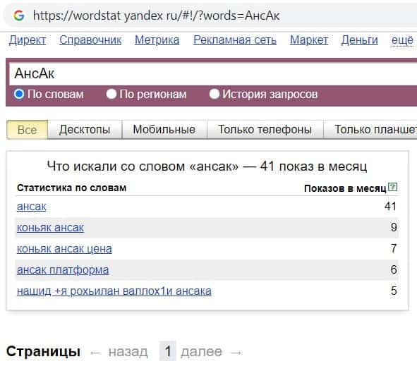 Проверили мы так же количество запросов фирмы Анс Ак по русскоязычному названию, но без пробела, а именно "АнсАк". Данный запрос пользователи выполнили всего 41 раз.