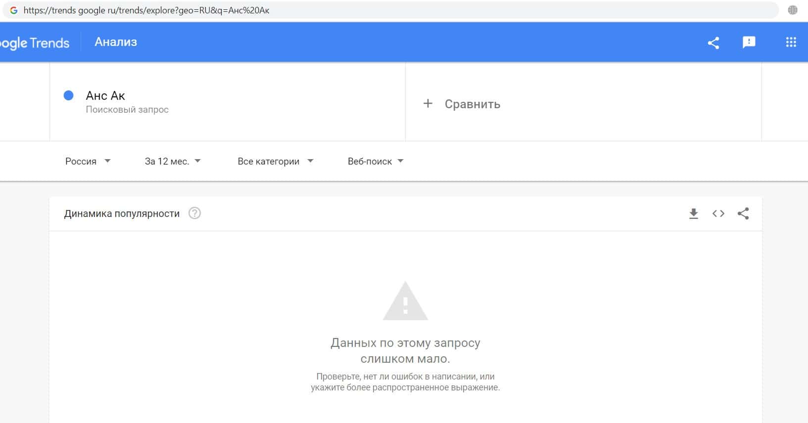 Ещё мы решили проверить количество запросов конторы аферистов Анс Ак по русскоязычному названию без пробела, а именно "АнсАк". Но результат оказался нулевым.
