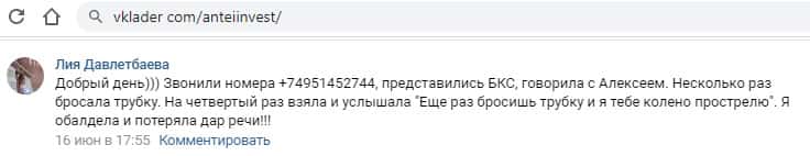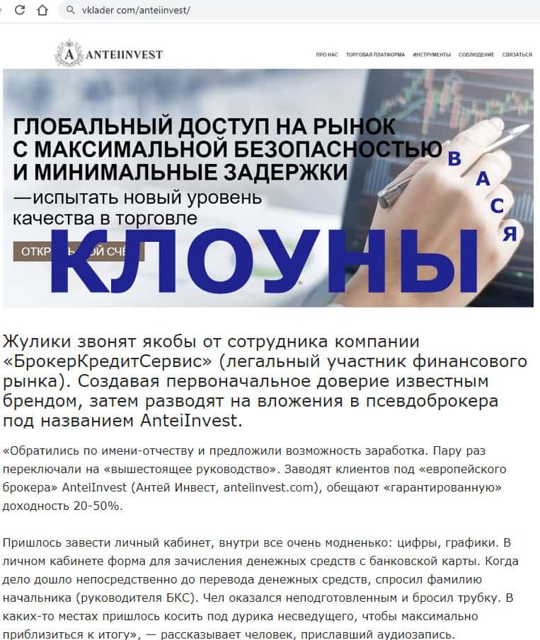 Доходит до того, что AnteiInvest представляются другим авторитетным брокером "БрокерКредитСервис", который на рынке довольно известен. Именно от его имени мошенники звонят эти аферисты, чтобы вызвать у человека первоначальное доверие к себе. А чем все в итоге заканчивается, мы уже знаем.