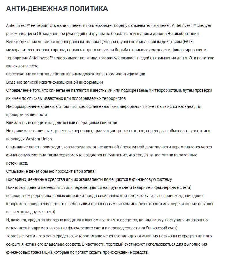 При этом Антей Инвест рассказывают о том, что придерживаются закона Великобритании об отмывании денег. Ну это лишь для того, чтобы как можно сильнее замылить вам глаза и вы теряли голову. Мол смотрите, какие мы надежные и безупречные. Ну кинем вас на деньги пару раз, ну и что?