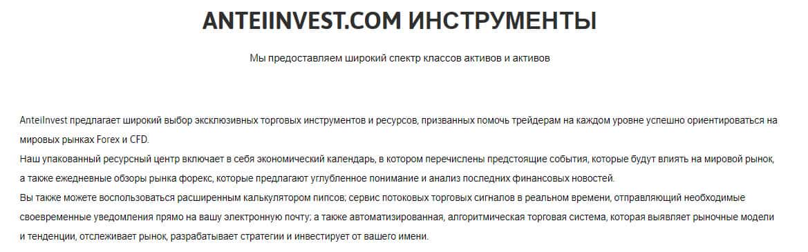 Антей Инвест рассказывают о том, что у них в арсенале есть много инструментов и ресурсов, которые призваны помочь помочь трейдерам успешно ориентироваться на финансовых рынках. Опять куча красивых слов без всякой конкретики, от которой вам, как клиенту, не будет никакого толка.