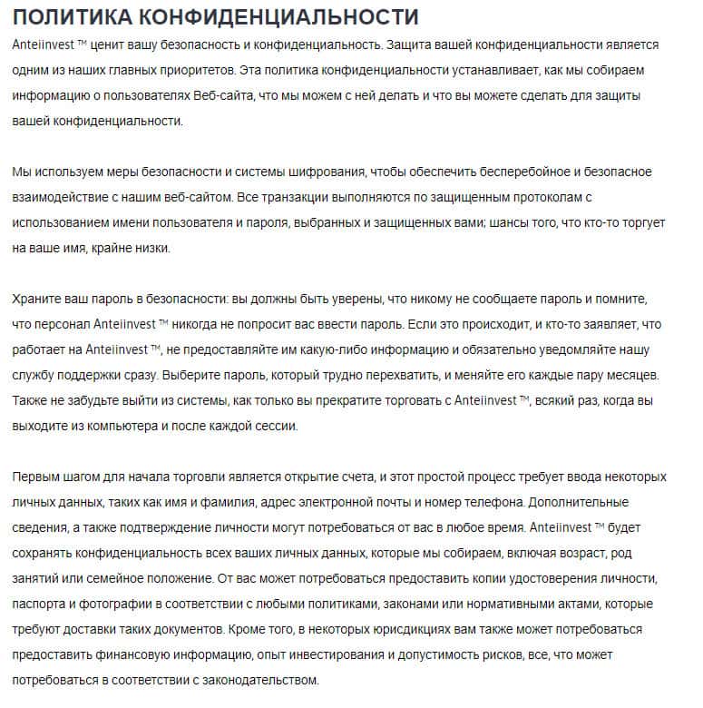 С политикой конфиденциальности Антей Инвест дела обстоят точно также, как и с договором: она есть, но это не дает вам вообще никаких гарантий, потому что мошенники после скама (а он непременно будет)легко передадут ваши персональные данные в руки третьим лицам. А там уже возможно много разных вариантов...