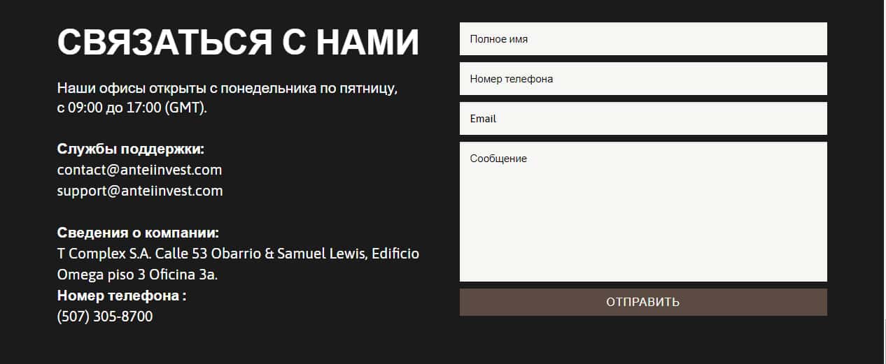 - по адресу электронной почты contact@anteiinvest com, support@anteiinvest com