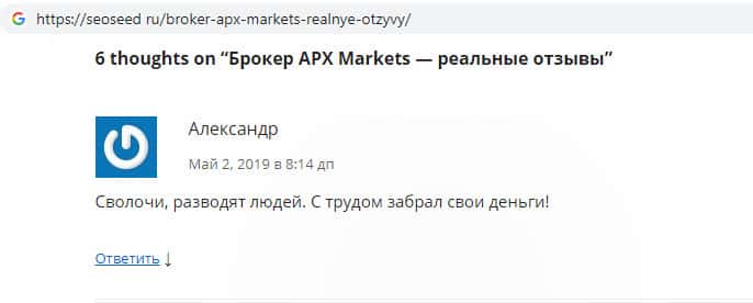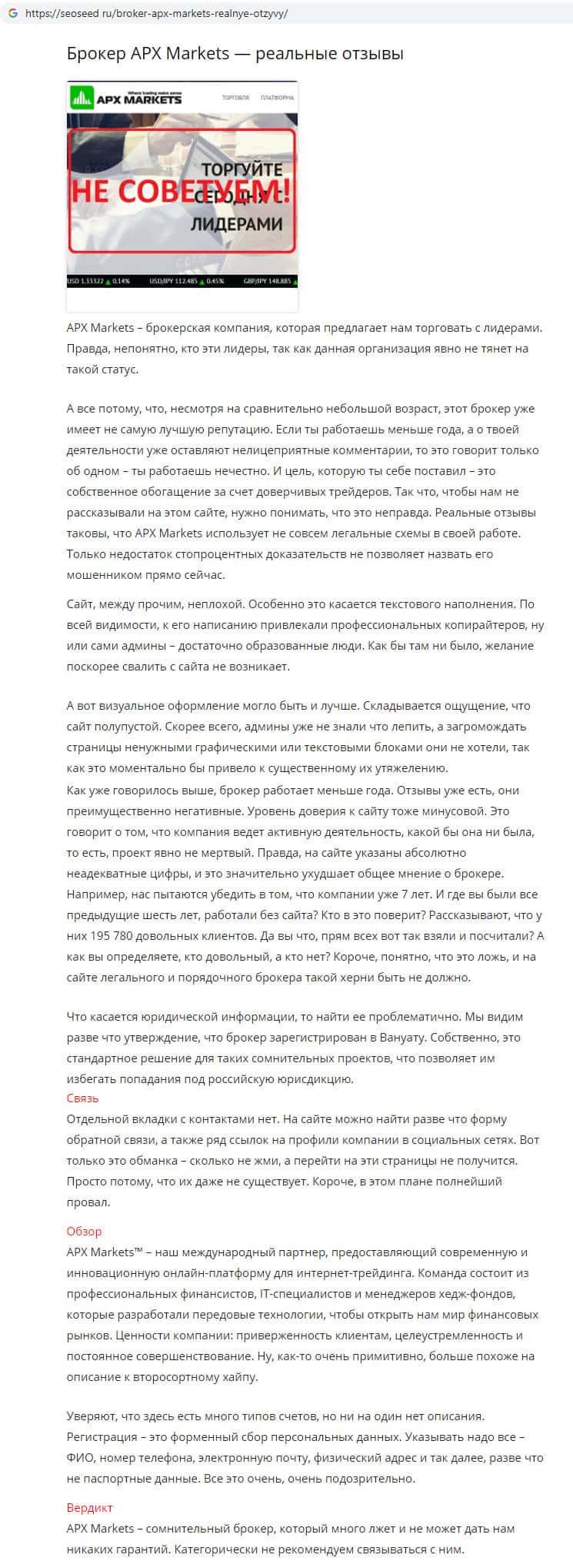 Статья-отзыв о скам-брокере APX Markets найдена на информационном сайте seoseed ru