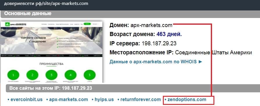 С помощью онлайн-ресурса довериевсети рф было выявлено, что сайты скам-брокера АПХ Маркетс и мошенников Зенд Опционс находятся на одном IP-адресе. Это в свою очередь означает, что конторы АПХ Маркетс и Зенд Опционс - одна группа мошенников.