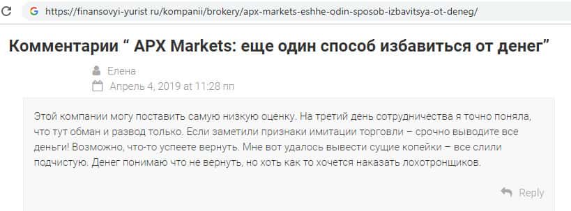 - Комментарий некой Елены на сайте finansovyi-yurist ru о жуликах APX Markets