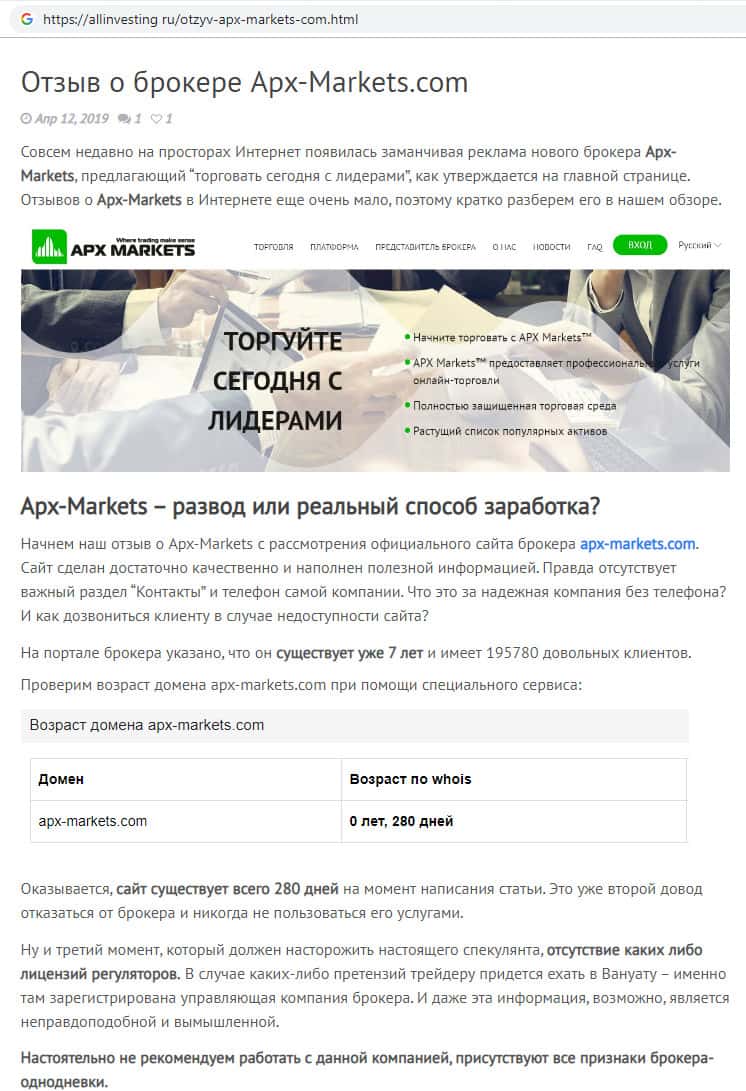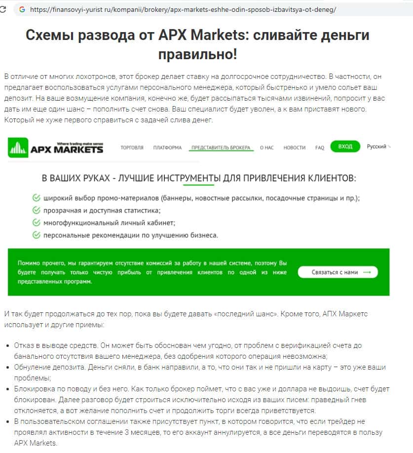 - Статья-обзор найдена на сайте infoscam ru о жуликах компании APX Markets