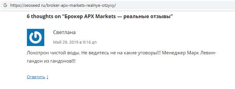 - Очередной отзыв некой Светланы APX Markets найден на информационном ресурсе seoseed ru
