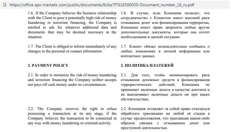 Контора АПХ Маркетс на своем официальном сайте предоставляет документ о борьбе с отмыванием денежных средств, указывая там, что АПХ Маркетс может запросить любой дополнительный документ у клиента, который компания сочтет необходимым в данной ситуации, не указывая при каких именно обстоятельствах это может произойти.
