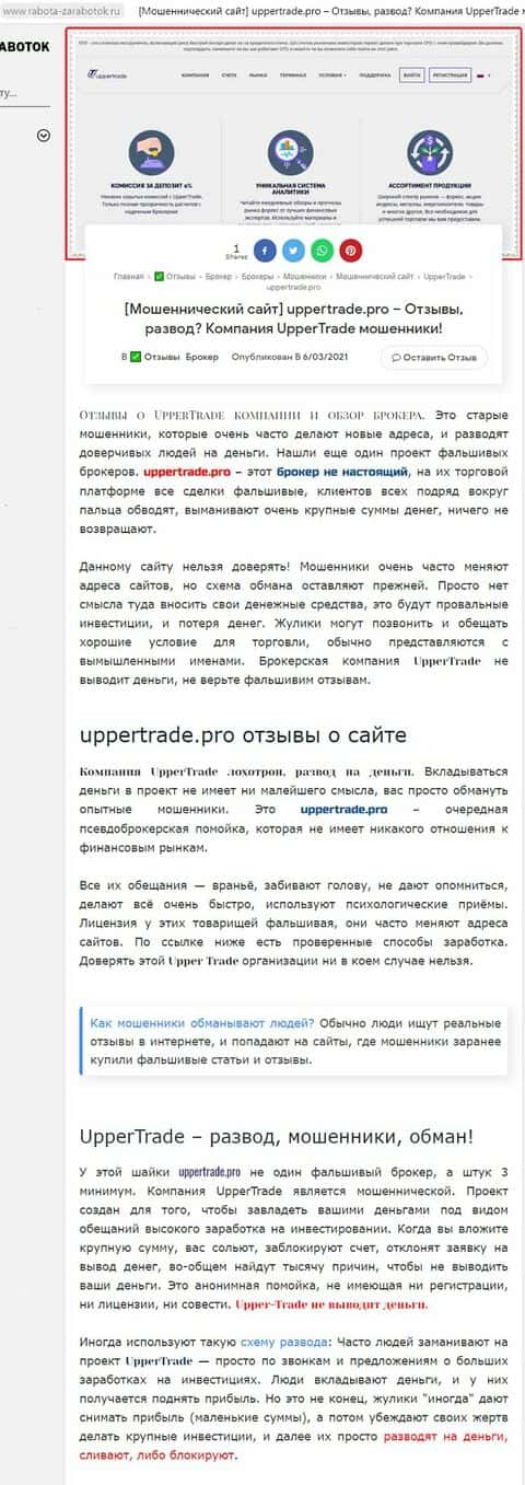 Хапуги Аппер Трейд только начинают свою мутноброкерскую деятельность, поэтому обзоры в интернете только начинают появляться. Ниже предлагаем вашему вниманию обзор с сайта rabota-zarabotok ru.