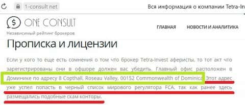 Кроме того, мы нашли информацию, что указанный адрес, а именно: 8 Copthall, Roseau Valley, 00152, Содружество Доминики, уже находится в черном списке одного из регуляторов, как рассадник всяческих лохотронных шарашек.