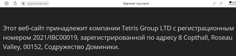 По заверениям самих лохоброкеров Аппер Трейд их сайт принадлежит компании Tetris Group LTD, регистрационный номер 2021/IBC00019, зарегистрированной по адресу: 8 Copthall, Roseau Valley, 00152, Содружество Доминики.