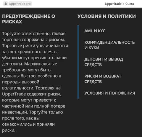 Официальный сервис разводил Аппер Трейд такой же мутный, как и их реальная лже-брокерская деятельность. Убогий дизайн, примитивные тексты - все это свойственно низкобюджетной пустышке uppertrade pro.