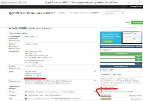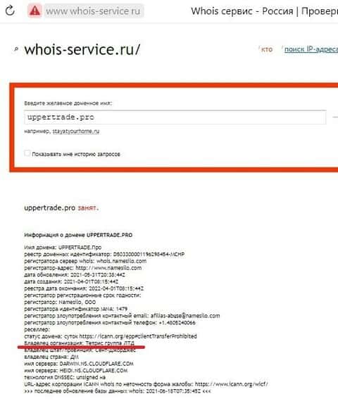 Сервис Whois выявил, что в качестве хозяина доменного имени uppertrade pro выставлена организация Тетрис группа ЛТД.