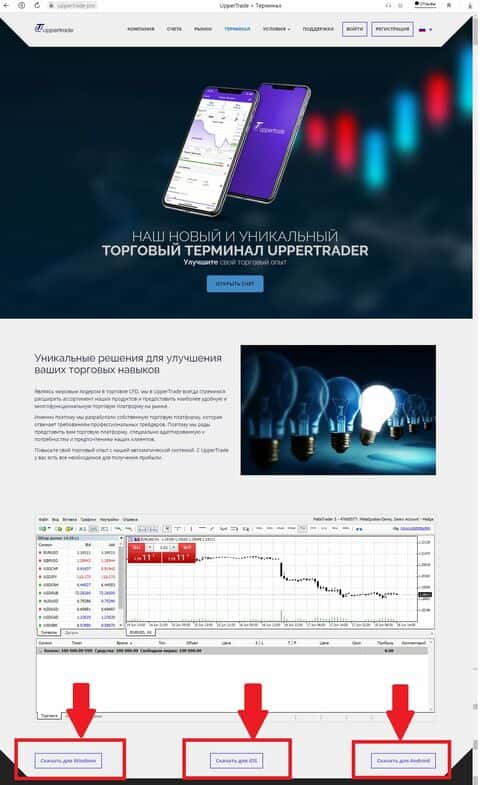 Для проворачивания своих мутных делишек пройдохи Аппер Трейд всячески заманивают неопытных трейдеров на свой торговый терминал. Он доступен для скачивания на все виды устройств. Но не вздумайте сделать это, мошенники сразу получат доступ ко всем вашим данным!