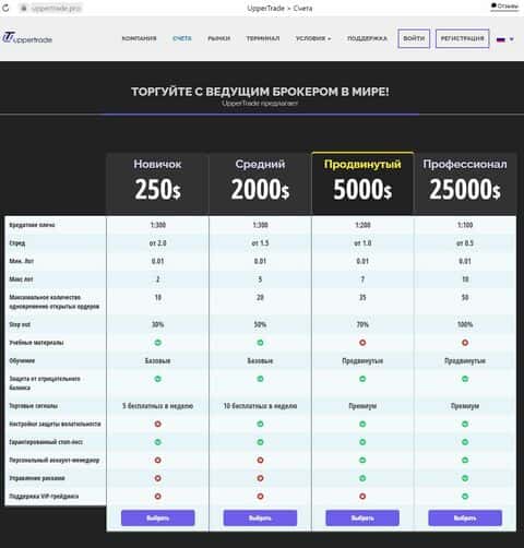 - Типы счетов, предлагаемых мутноброкерами Аппер Трейд