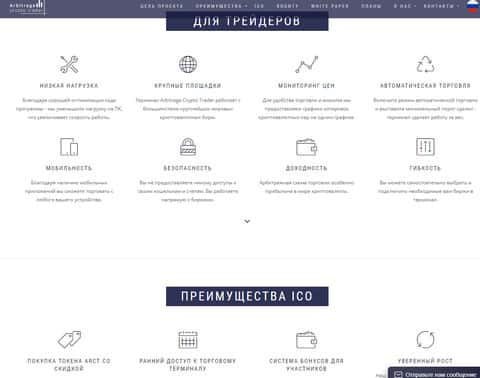 Далее у лохотрона Арбитраж Крипто Трейдер следует раздел с описанием якобы деятельности мошенников Arbitrage Crypto Trader, по словам которых они готовы предоставить вам доступ к очередным "чудо" технологиям совершенно бесплатно. На изображении ниже вы можете увидеть следующий раздел сайта лохотрона.
