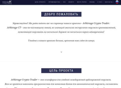 Начинается сайт у шулеров Арбитраж Крипто Трейдер с довольно банальной и типичной шапки сайта, в которой аферисты Arbirage Crypto Trader начинают загонять о своей уникальности и очередной "чудо платформе" по заработку денег, которой мошенники Арбитраж Крипто Трейдер любезно готовы поделиться.