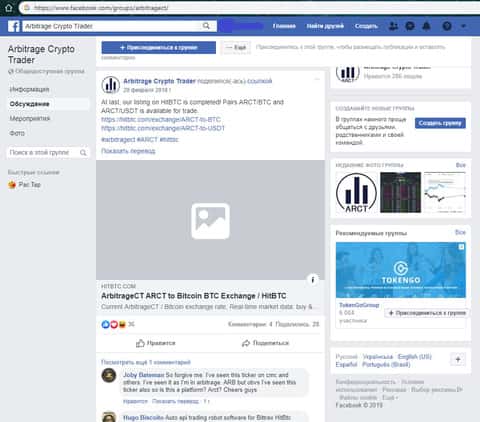 Имеется у жуликов Арбитраж Крипто Трейдер и страница в социальной сети Facebook, которая заброшена еще с 2018 года и не публикует новые записи, хотя шулера Arbitrage Crypto Trader и накрутили 6 тысяч подписчиков. На изображении, расположенном ниже вы можете увидеть страницу лохотрона Арбитраж Крипто Трейдер в социальной сети Фейсбук.