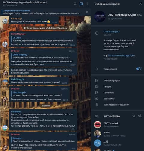 Имеется у аферистов Арбитраж Крипто Трейдер и страница в Телеграм, точнее чат, в котором у мошенников Arbitrage Crypto Trader состоит почти тысяча наивных пользователей, которые повелись на лапшу жуликов Арбитраж Крипто Трейдер. На изображении ниже вы можете увидеть чат лохотрона Arbitrage Crypto Trader в Телеграм.