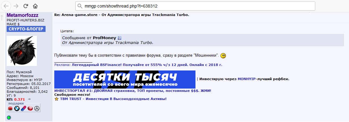 Отзыв о шаражке Arena-Game на известном форуме обзора хайпов