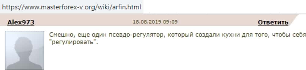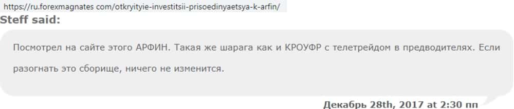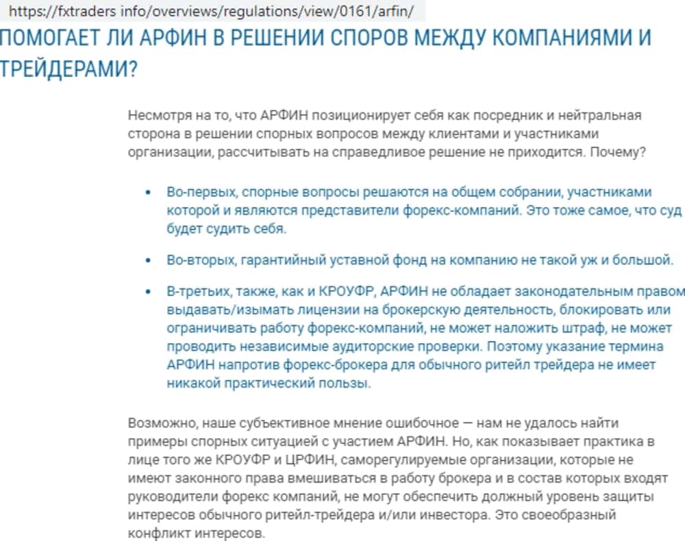 Снова обратили внимание трейдеры с веб-сайта forexmagnates com на пройдох АРФИН. Компашка проходимцев, созданная такими же проходимцами, никогда не будет внушать доверия. Вся их суть - это прикрывать свои грязные махинации по обворовыванию своих клиентов. И псевдорегулятор будет лишь инструментом для этого.