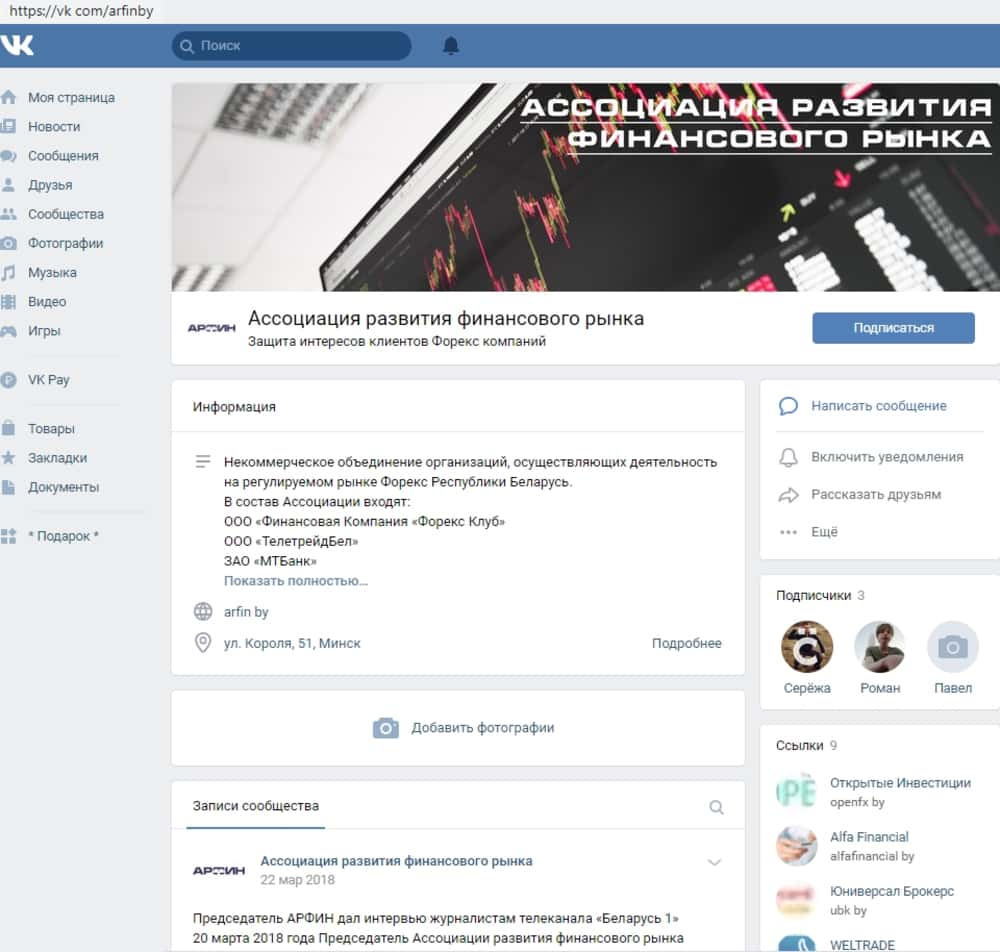 Популярная сеть vk com тоже приняла разводил ARFIN By в свои объятия. Правда контент немного сомнителен. Его публикует некий блогер Сережа Прохоров имеющий 2 собственных ресурса наполнение которых имеет мало отношения к работе лжерегулятора ARFIN By. Количество подписчиков также не прибавляет авторитета.