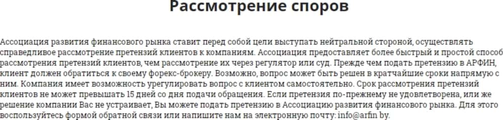 Как такового соглашения, договора на официальном сайте компании по разводу наивных пользователей ARFIN By не нашлось. Есть некая отписка представляющая собой простое описание процесса принятия жалоб и претензий. Но сперва жулье ARFIN By все же просит клиента самим разобраться с брокерами-лохотронщиками.