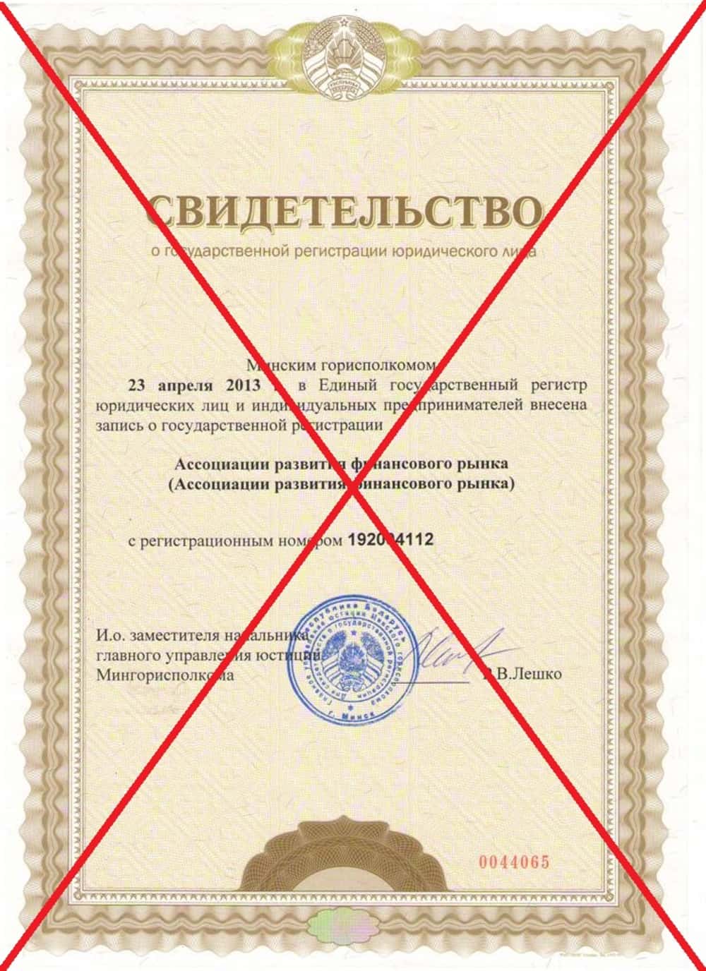 На официальной страничке антирегулятора АРФИН представлено свидетельство о госрегистрации. Эта бумажка, полученная жуликами АРФИН, позволяет прикрывать свои злодеяния якобы покровительством Мингорисполкома. Но наличие этого свидетельства не значит ровным счетом ничего. Очередная подстава.