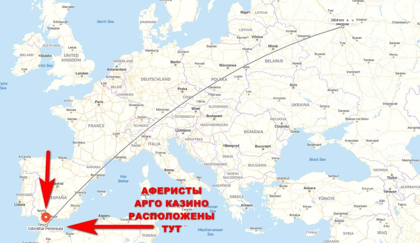Исходя из официальных данных о конторе Арго Казино, мошенники разместили свой главный офис на территории оффшорного государства Гибралтар, которое далеко от Москвы.