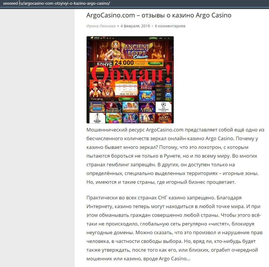 Далее представлена еще одна статья касательно лохотронского казино ArgoCasino. В тексте указано, что это очередной мошенник, который использует множество зеркал.