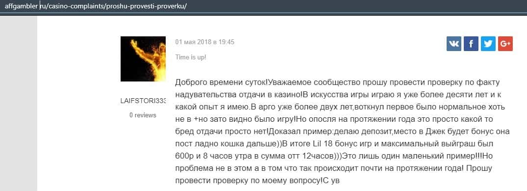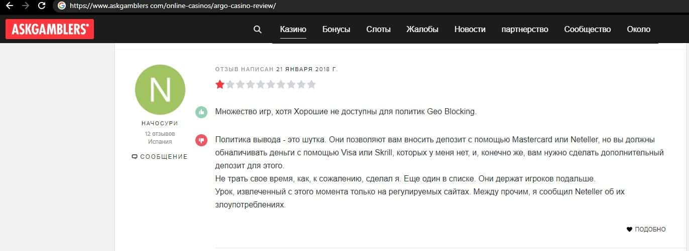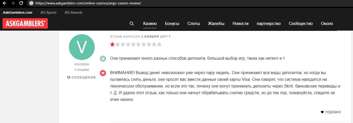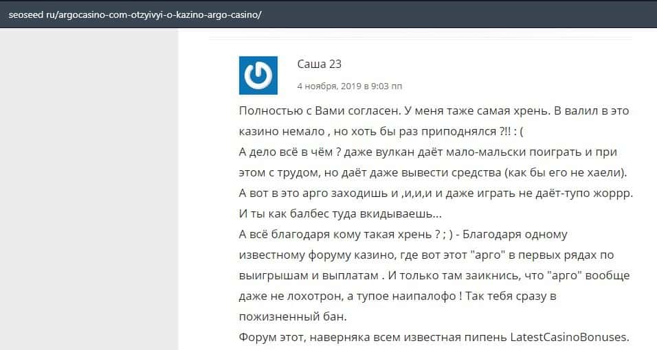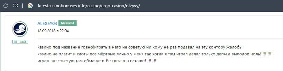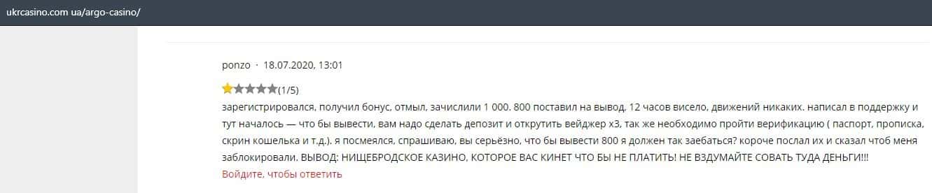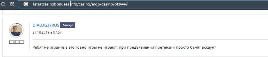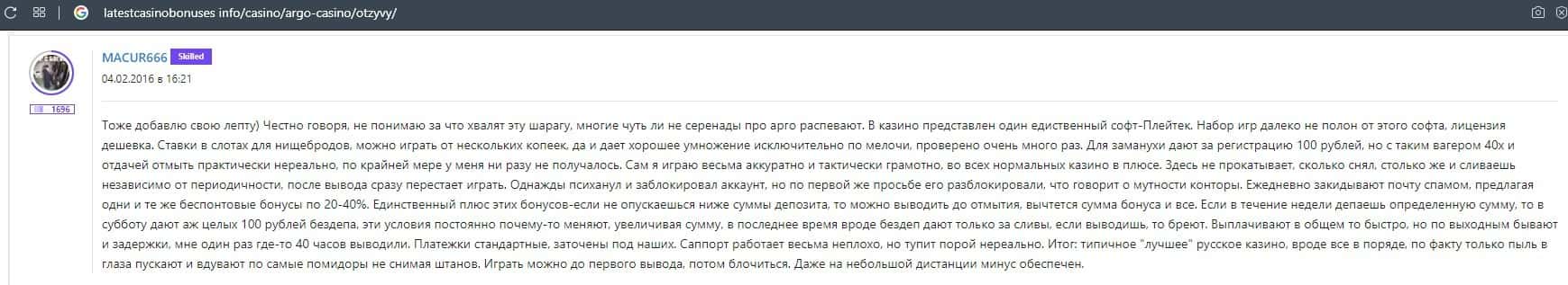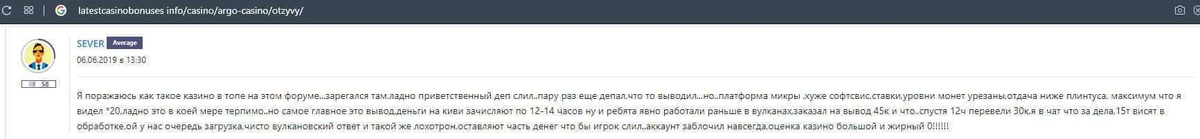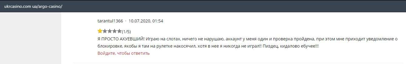 Еще один клиент жалуется в своем отзыве, что мошенническое недоказино Арго Казино заблокировало ему счет как только он все слил. Теперь восстановлению ничего не подлежит.