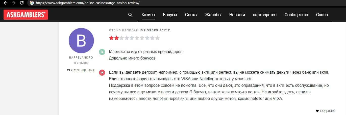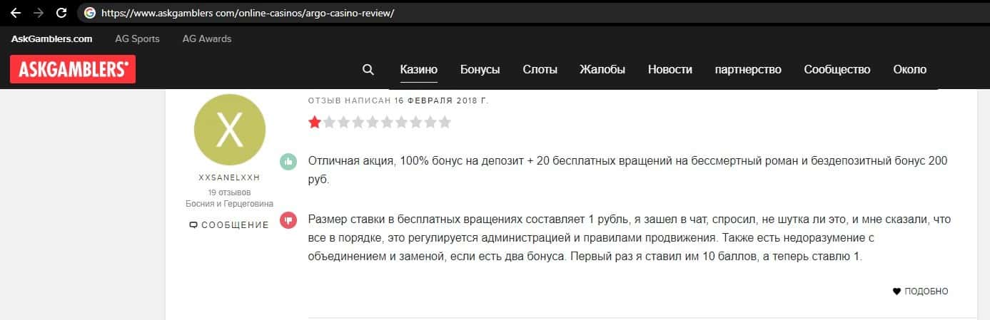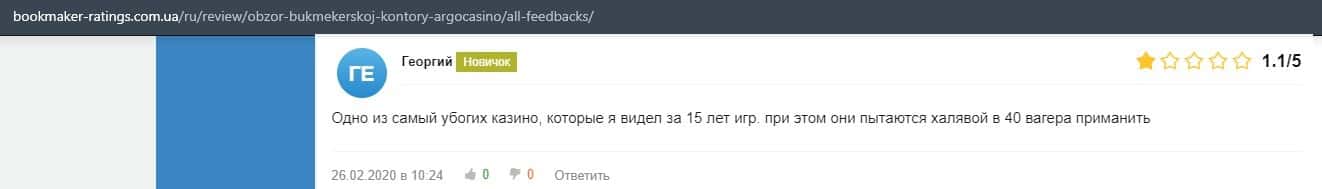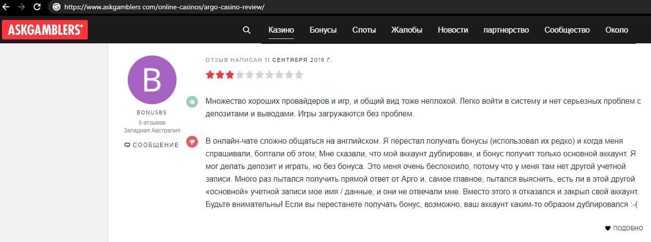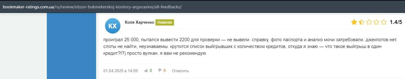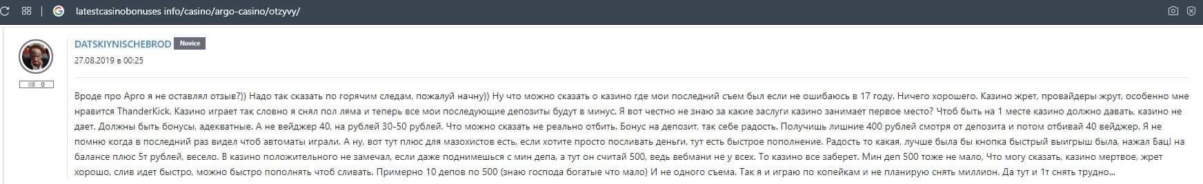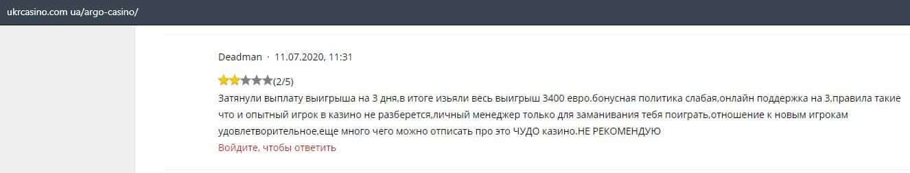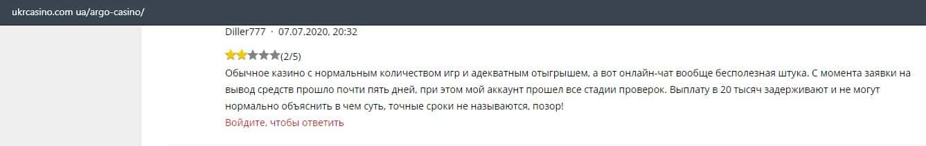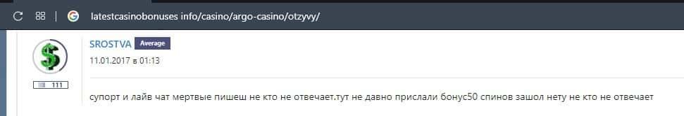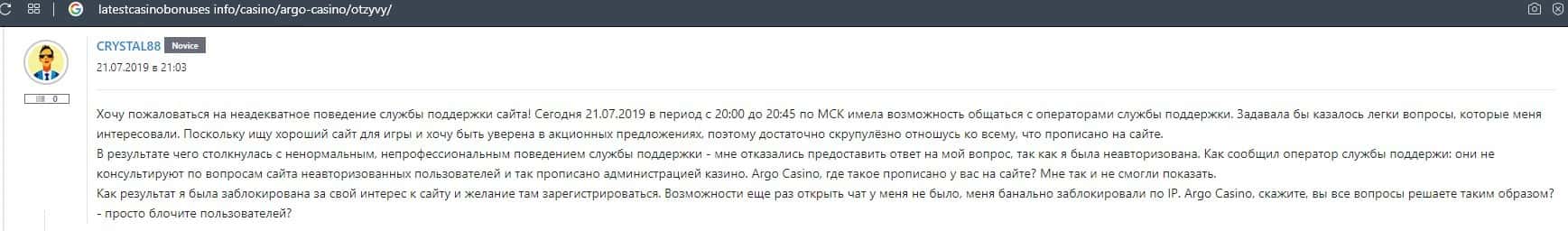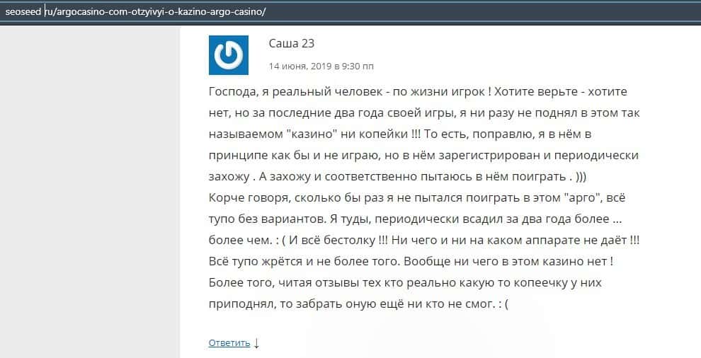 Клиент утверждает, что в конторе Арго Казино работают неадекваты, поэтому он и решил описать в своем отзыве. Ответить на конкретно поставленный вопрос они не могут вообще.