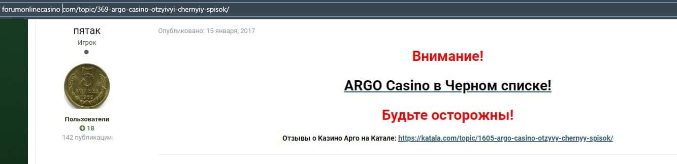 Данная публикация с одного популярного форума указывает, что с конторой ArgoCasino следует быть осторожным. Казино ArgoCasino находится в черном списке и это не шутки.