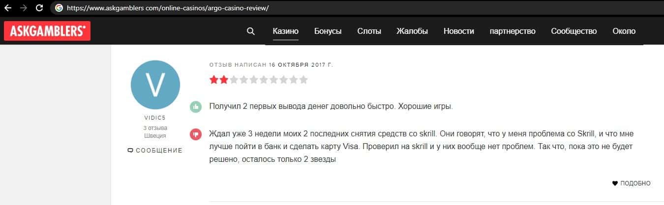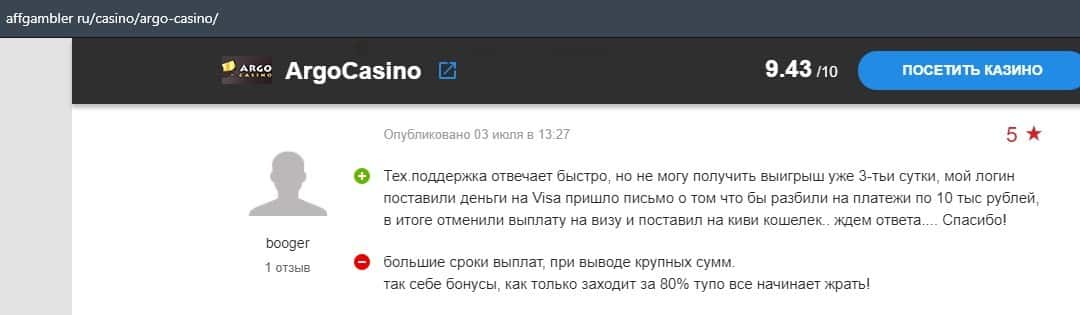 В этом отзыве клиент жалуется, что лохотронское казино Арго Казино не платит своим клиентам. Поэтому ни при каких обстоятельствах не нужно даже пытаться с ними играть.