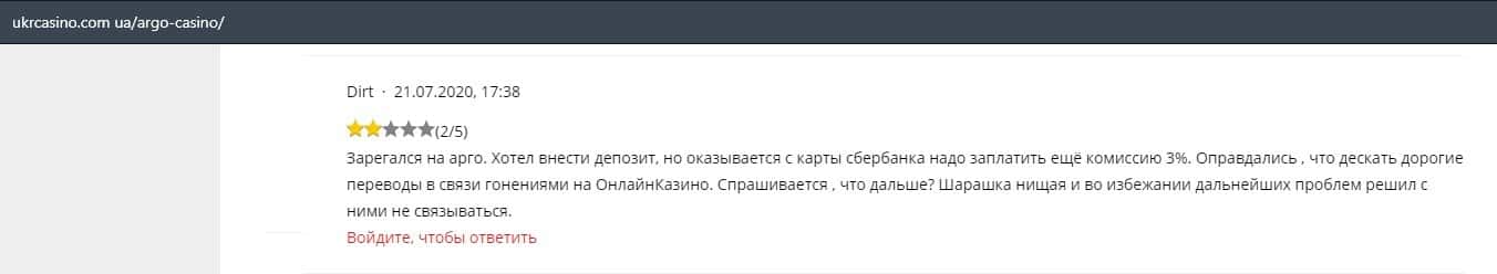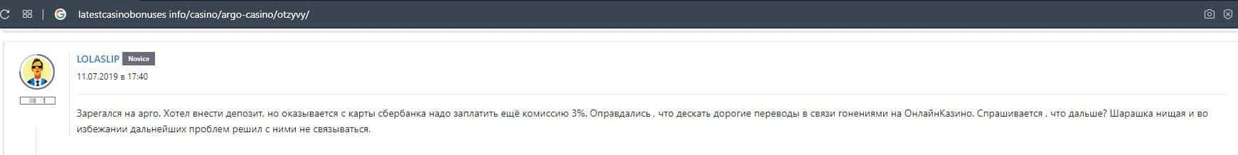 Очередной клиент конторы Арго Казино подметил, что там очень огромные комиссии на депозит. В его случае за перевод мошенники предложили заплатить комиссию в размере 3%.