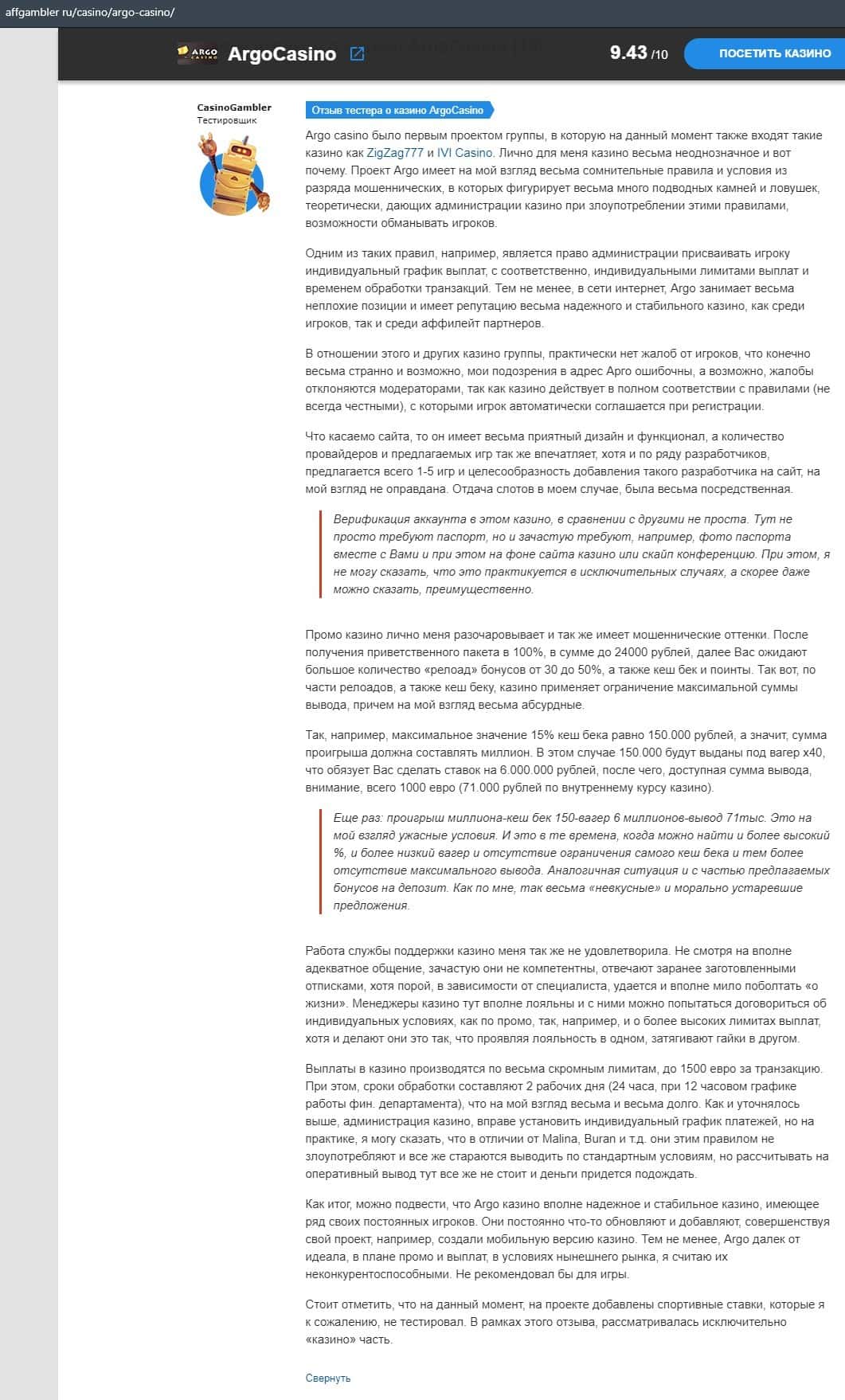 Далее представлен подробный отзыв о мошенническом казино ArgoCasino, где эксперт описывает все негативные стороны его работы. А соответственно доверять аферистам нельзя.