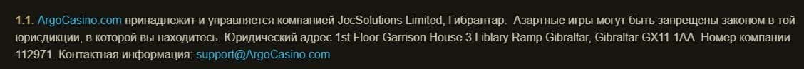 Судя по официальным данным конторы Арго Казино ею управляет некая компания под названием JocSolutions Limited, зарегистрирована на территории оффшорного Гибралтара.