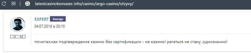 Пользователь интернета решил не регаться в конторе Арго Казино, так как мошенники работают без сертификации и соответственно гарантий на возврат средств они не дают.