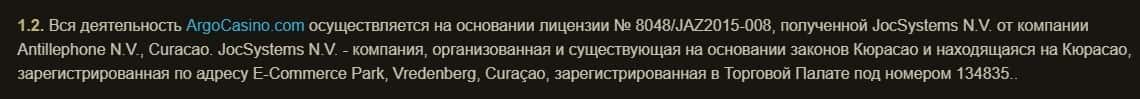 Что касается регулирования деятельности мошеннического казино Арго Казино, то здесь стоит отметить, что мошенники ссылаются на оффшорного регулятора с острова Кюрасао.