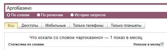 Что касается бренда в другой вариации "АргоКазино", то здесь почти нет никаких данных по Яндекс Вордстат, так как набрали всего-то один запрос за последний месяц.