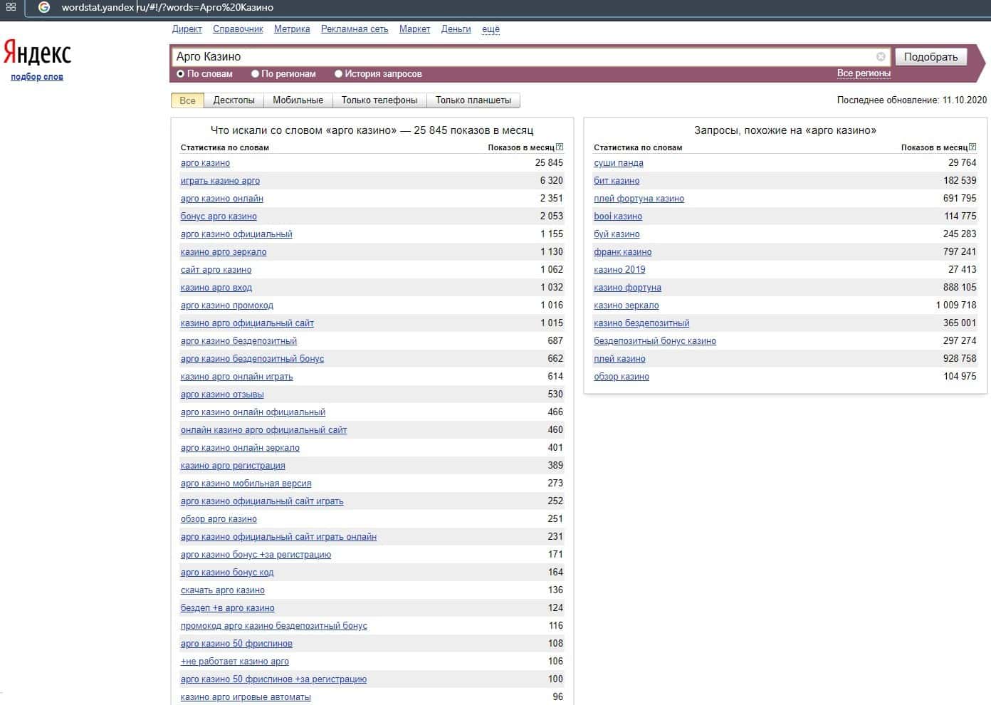 Мошенники по бренду "Арго Казино" получили очень большую популярность в Яндекс, так как смогли набрать свыше 25 000 показов за последнее время.