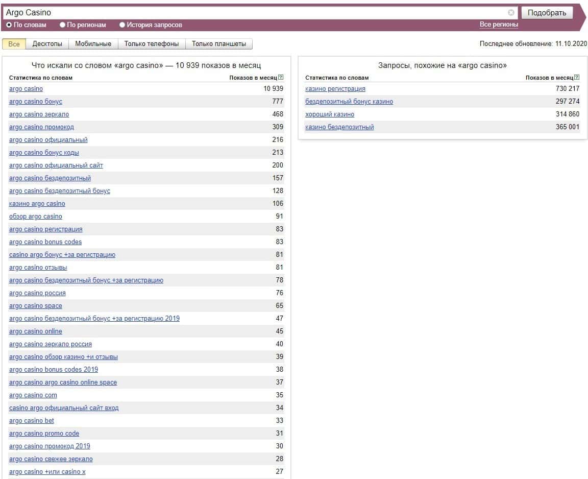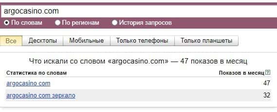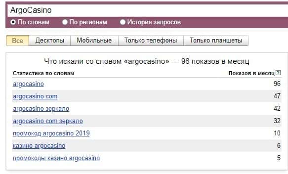Англоязычная версия бренда "Argo Casino" была введена свыше 10 000 раз в популярную поисковую систему Яндекс и это показывает их узнаваемость в сети.