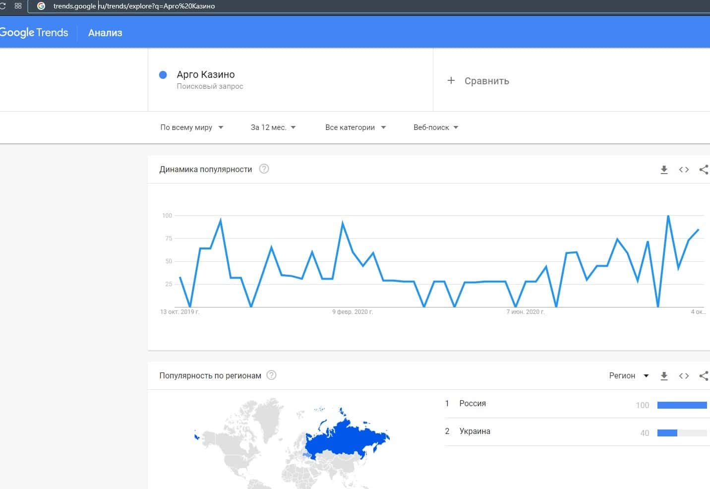 По версии Гугл Трендс мошенники с брендом "Арго Казино" набрали достаточное количество показов поэтому можно определить - запросы идут в основном из России и Украины.