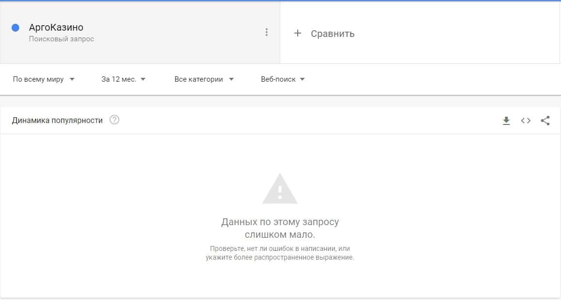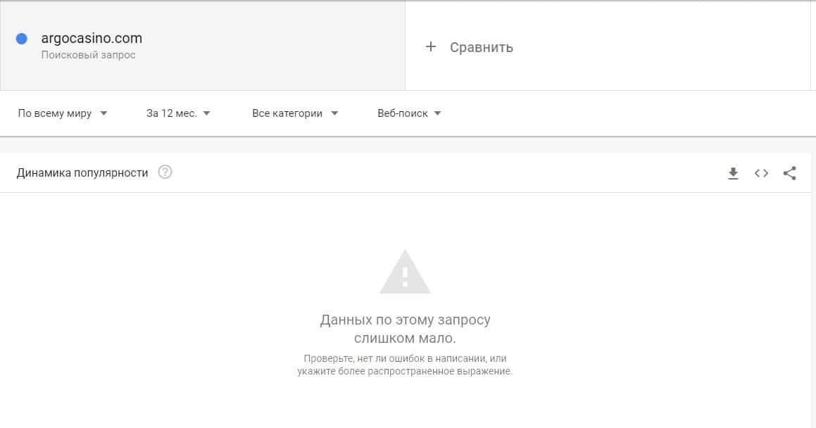Такая же ситуация и с обычным сайтом "argocasino.com", данных о котором в запросах Гугл Трендс не были обнаружены, так как форекс-лохотрон не популярен.
