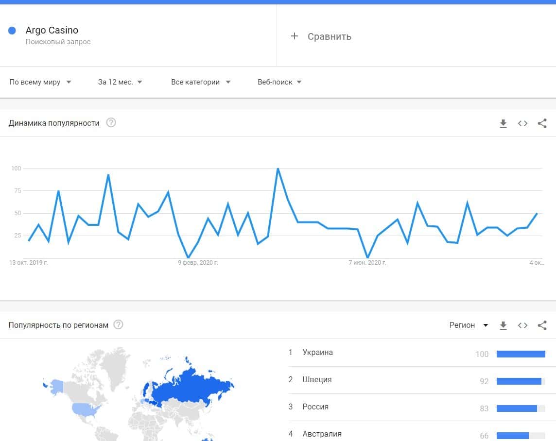 Касательно бренда "Argo Casino" здесь поисковая система Гугл выдала некоторые запросы и даже смогла определить источник трафика, а именно: Украина, Швеция, Россия и Австралия.