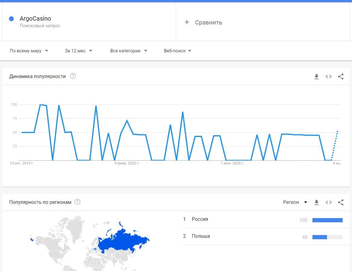 Мы также пробили сайт без точки в домене "ArgoCasino" и система Гугл Трендс выдала положительные значения за последний месяц и запросы шли из России и Польши.