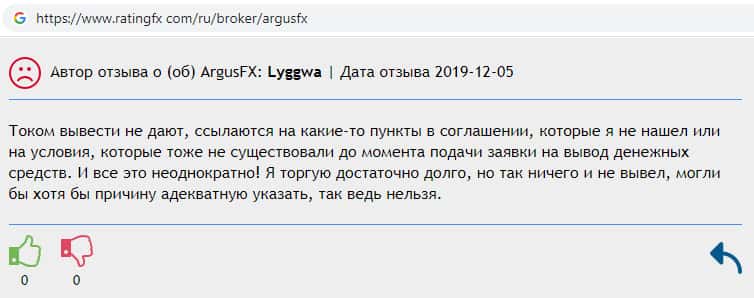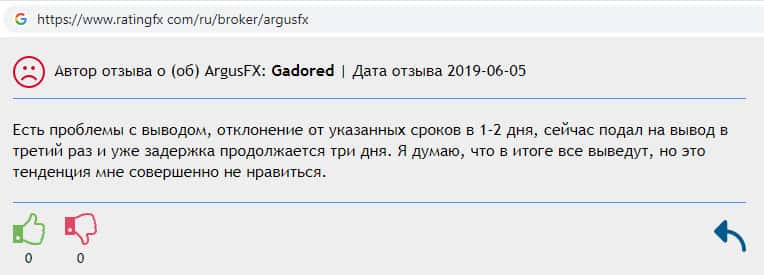 На веб-портале ratingfx com отыскан отзыв о скам-организации Аргус ФХ. Автор отзыва жалуется на проблемы с выводом денежных средств и в то же время надеется на то, что получит свои деньги обратно. Этого конечно же не будет потому, что компания ArgusFX не возвращает пользователям своего сайта даже вложенное.
